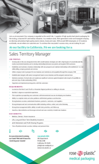 - Develop sales in the area designated in line with overall business strategies and with a high degree of concentration in the medical and dental industries and to develop relationships between rose plastic and targeted OEM customers